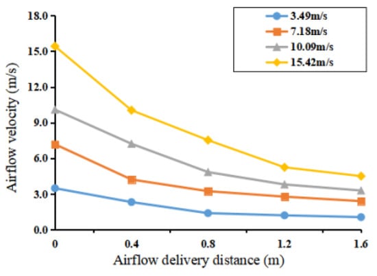 The measurement results of the airflow velocity at 15 Hz, 30 Hz, 45 Hz, and 60 Hz fan frequencies are shown in Figure 6. The relationship between airflow velocity and conveying distance is shown in the Figure 11. When the delivery distance was less than 0.4 m/s, airflow attenuation rate was fast. With the increase in delivery distance, the attenuation rate of airflow decreased and tended to be stable.