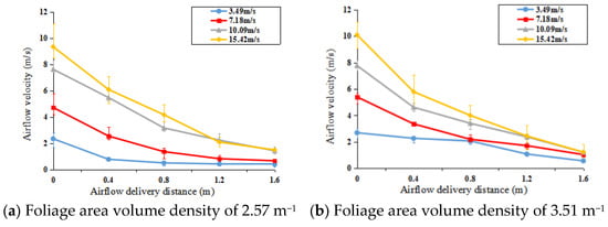 The airflow attenuation characteristics of different canopies were further studied. The canopy airflow attenuation measurement experiment was carried out for four types of canopies using the FAVD data from Table 6, and different fan frequencies were selected for the measurement. Five airflow velocity measuring points were arranged from near to far from the fan, and the distance between measuring points was 0.2 m. Preliminary relationships were drawn between the canopy airflow velocity and the canopy depth, airflow velocity, and foliage area volume density, as shown in Figure 12. Results show that the attenuation rate of the airflow velocity in the canopy decreased with increasing foliage area volume density and canopy depth.