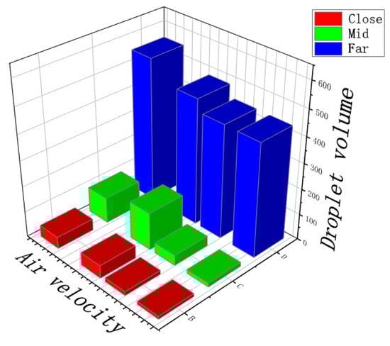 The spray distance was set to 0.8 m. The target plant with an FAVD of 5.83 m−1 was selected. Water was selected as the spray liquid (surface tension = 72.7 mN/m). The average droplet retention of each canopy for three measurement points is shown in Figure 13. When the measurement point was at a close distance and the airflow velocity was set to 3.49 m/s, the average droplet retention was 439.90.