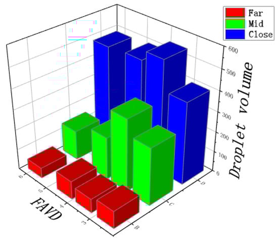 The spray distance was set to 0.8 m, the airflow velocity was set to 10.09 m/s, water was selected as the spray fluid (the surface tension value was 72.7 mN/m), and the spray droplet deposition volume of target plants under different FAVDs was calculated, as shown in Figure 14. As shown in Figure 14, there was no linear correlation between droplet deposition and FAVD, which may have been because the droplet deposition volume in the middle-distance layer was affected by the average leaf inclination of the leaves in the close-distance layer. The droplet penetration ratio of the middle-distance layer and the far-distance layer in the canopy was calculated and obtained, as shown in Table 12. From Table 12, it can be intuitively seen that the droplet penetration ratio of the middle-distance layer was negatively correlated with the FAVD, while the droplet penetration ratio in the canopy decreased with increasing FAVD.