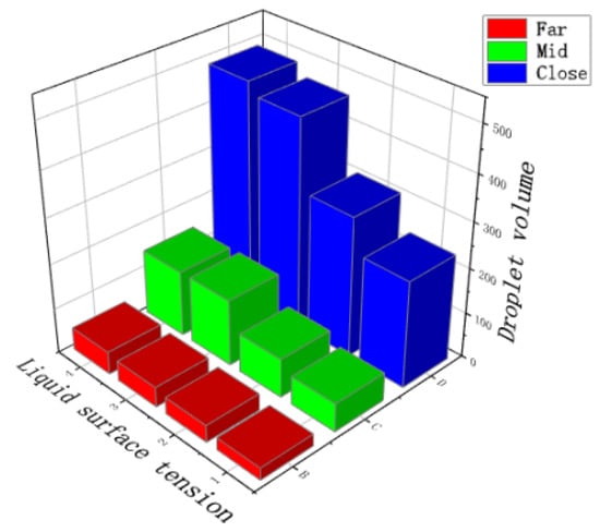 The relevant parameters of the spray experiment were set as follows: spray distance of 0.8 m, spray volume of 150 mL, target plants with foliage area volume density of 5.83 m, and airflow velocity of 10.09 m/s. There was a positive correlation between the droplet deposition volume and liquid surface tension value.The average droplet retention of each canopy for three measurement points is shown in Figure 15.