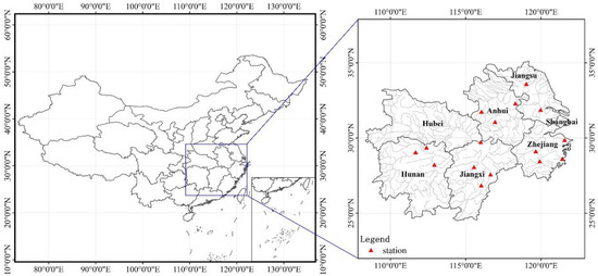 The study area is the middle and lower reaches of the Yangtze River (Figure 1). The details of the agrometeorological stations in the study area were shown in Table 1. Data of rice heat stress from 1991 to 2009 were obtained. These data were maintained by the China Meteorological Administration (CMA). Daily weather data were obtained from the Chin Meteorological Administration (CMA). The future climate scenarios were constructed from the Regional Integrated Environmental Model (RIEMS) [24,25,26].