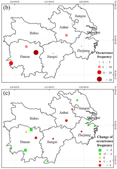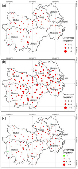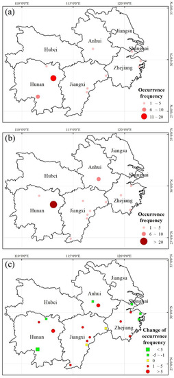 The observations of early rice heat stress from 1990 to 2000 and from 2000 to 2009 showed that the heat stress on rice in Hunan occurred in a few stations, and the frequency of occurrence was the largest. Jiangxi Province has the largest number of stations with heat stress. Comparing the two periods of 1990–2000 and 2000–2009, the frequency of heat stress of early rice increased in most stations (Figure 2).