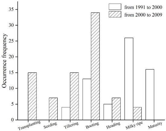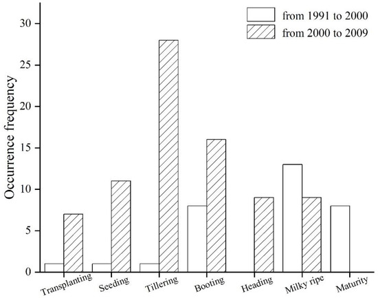 According to the statistics of heat stress in different growing periods of early rice, it can be found that heat stress of early rice mainly occurs from the tillering stage to the maturity stage. Heat stress occurred mainly at the booting stage, milky ripe stage, and maturity stage at the early rice stations in the study area. From 2000 to 2009, the heat stress of early rice stations in this region mainly occurred in the stage from transplanting to milky ripe, which occurred earlier than that in 1990–2000, and the number of occurrences in each stage increased compared with that in 1990–2000 (Figure 3).