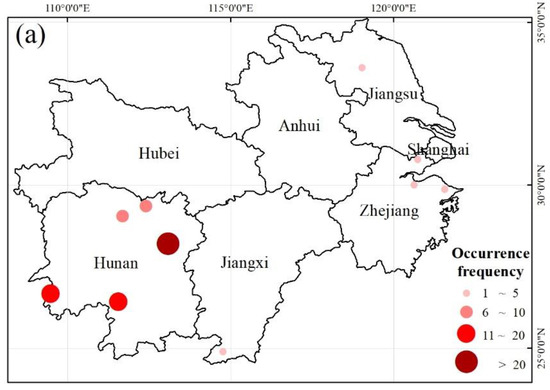 Due to the limited observations of national agrometeorological stations, it is difficult to investigate the occurrence of rice heat stress in the study area. Therefore, based on the standard of rice heat stress and meteorological data issued by the China Meteorological Administration, we counted the occurrence of disasters in the corresponding period (Figure 6).