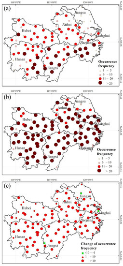 Occurrence frequency of heat stress to early rice in study area from 1991 to 2000 (a) and from 2000 to 2009 (b) and change of occurrence frequency (c).