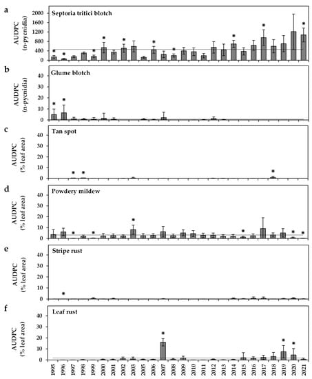 Average of disease severities from 1995 to 2021 (grey line) and annual disease severities (AUDPC; GS 30 to 77; bars) of (a) Septoria tritici blotch (number of pycnidia), (b) glume blotch (number of pycnidia), (c) tan spot (percentage of leaf area affected), (d) powdery mildew (percentage of leaf area affected), (e) stripe rust (percentage of leaf area affected), and (f) leaf rust (percentage of leaf area affected) on the upper six leaves (F-0 to F-6) of winter wheat (cultivar “Ritmo”) in the untreated control of the eight trial locations in northern Germany from 1995 to 2021. Significant (p ≤ 0.05) annual differences of disease severities from the average (grand mean) are marked with *.