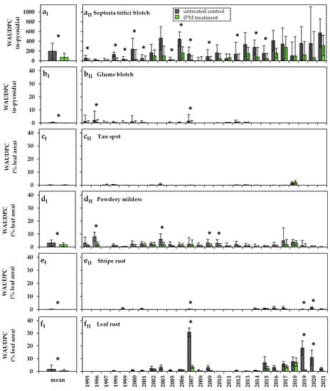 Total (aI–fI) and annual (aII–fII) weighted disease severities (WAUDPC; F-0 70%; F-1 20%; F-2 10%; F-3 to F-6 0%) of (a) Septoria tritici blotch (number of pycnidia), (b) glume blotch (number of pycnidia), (c) tan spot (percentage of leaf area affected), (d) powdery mildew (percentage of leaf area affected), (e) stripe rust (percentage of leaf area affected), and (f) leaf rust (percentage of leaf area affected) of the untreated control (black bars) and IPM treatment (green bars) of winter wheat (cultivar “Ritmo”) of the eight trial locations in northern Germany from 1995 to 2021. Significant (p ≤ 0.05) differences treatment differences are marked with *.