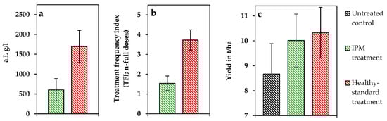 (a) Total use of fungicidial active ingredient (a.i) in the healthy-standard treatment and the IPM treatment (average in g per litre), (b) total treatment frequency index of the healthy-standard treatment and IPM treatment and (c) total yield (t/ha) of the untreated control, IPM treatment and healthy-standard treatment of winter wheat (cultivar “Ritmo”) at the eight trial locations in northern Germany from 1995 to 2021.