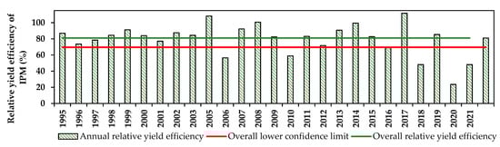 Overall relative yield efficiency (green line), overall lower confidence limit (red line; α = 0.05) and annual relative yield efficiency of the IPM treatment (green bars) in relation to the healthy-standard treatment adjusted by the untreated control from 1995 to 2021.