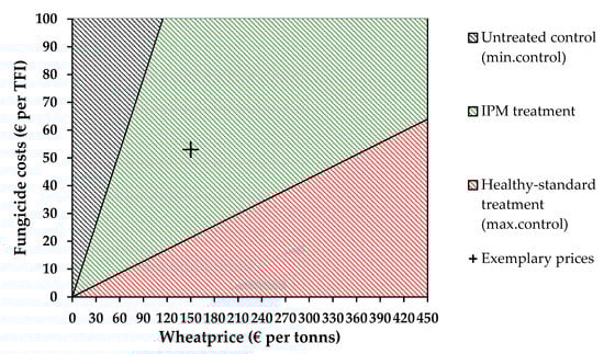 For further evaluation, the IPM efficiency was considered economically. According to the trail design, two factors influenced the economic efficiency, namely the wheat price (PW) and the total costs for the fungicide application (PF; including application costs and fungicide costs). By equalizing the profit function (π) of the untreated control (πuntreated control = 8.66 t/ha × PW) and the IPM treatment (πIPM = 10.01 t/ha × PW − 1.54TFI × PF), the marginal profit was determined. With decreasing wheat prices and increasing fungicide costs, the untreated control shows the highest economic efficiency (Figure 5; black area). In contrast, the profit function of the healthy-standard treatment (πhealthy-standard treatment = 10.32 t/ha × WP − 3.73TFI × FP) has been equalized with the IPM treatment, and the marginal profit was determined. With increasing wheat prices and decreasing costs for fungicides, the healthy-standard treatment has the highest economic efficiency (Figure 5; red area). With moderate wheat prices and fungicide costs, the IPM treatment showed the highest economic efficiency (Figure 5; green area). According to Kamrath et.al. [41], the cost for one full fungicide dose (one TFI) is approximately 53.89 € per ha in the survey area. Together with an assumed wheat price of 150.20 €/t, the IPM treatment is the superior treatment for current farm practices in the survey area (Figure 5; black cross).