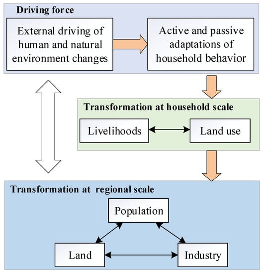 Conceptual model of rural transformation linking household scale and regional scale.