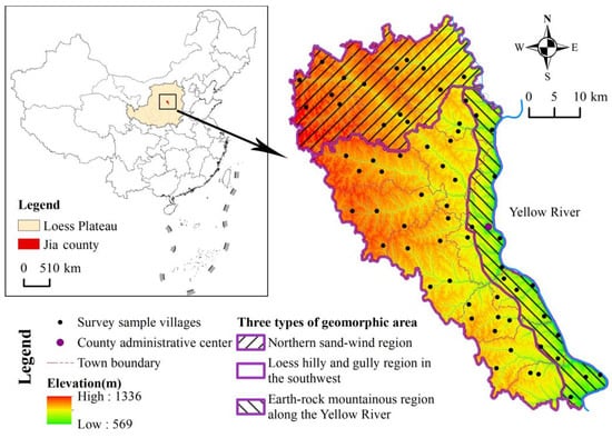 The study was conducted in Jiaxian County within the Chinese Loess Plateau. The Chinese Loess Plateau, located in the range of 100°52′ to 114°33′ E and 33°41′ to 41°16′ N, with a total area of 646,200 km2, characterized by drought, fragile ecology, and poverty, and an area of soil and water loss reaching 390,800 km2, is a key practice area for ecological restoration and poverty alleviation in China [66]. Jiaxian County is located at the northern end of the Loess Plateau in northern Shaanxi, the west bank of the middle Reaches of the Yellow River and the southern margin of the Mu Us Desert, with a total land area of 2029.3 km2. Moreover, the Loess Plateau is a key practice area for ecological restoration and poverty alleviation in China. The county has jurisdiction over 12 towns, 1 sub-district office, 8 urban communities, and 330 administrative villages, with a population of 269,400 people under its jurisdiction [47]. The region is a continental arid and semi-arid climate, with an average annual temperature of 10.2 °C and an average annual precipitation of 386.6 mm, and the precipitation generally concentrates in July to September, whilst drought, flood, frost, hail, and other natural disasters are frequent [67].