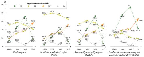 The temporal and spatial changes in livelihood activities have the following characteristics. First, livelihood activities in the whole region and three different regions followed a similar trajectory from the 1980s to 2017. As for the SJ livelihood, the proportion continued to rise, reaching the highest value in 2008 and then plunging. As for the TF livelihood, the proportion increased from the 1980s to 2000 and has continued to decline since then. As for the NF livelihood, the proportion showed a gradual increase from the 1980s to 2017, and was more than half of households in each region in 2017. For the Un livelihood, the proportion experienced a trajectory of initially declining and then increasing (Figure 3).