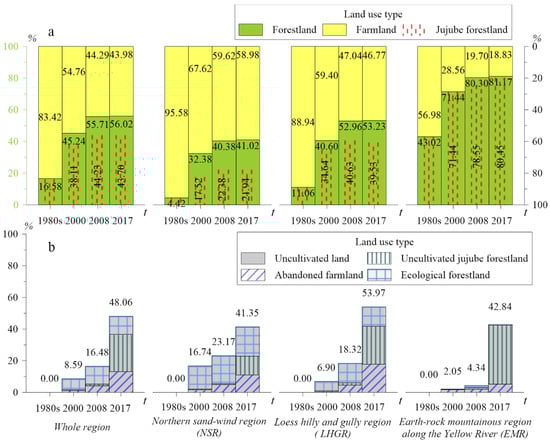 The conversion tracks of forestland and farmland are similar in the whole region and three regions, and the forestland was dominated by jujube forest all of the time (Figure 4). The conversion from farmland to forestland was approximately 30% in stage 1, and approximately 10% in stage 2. Since 2008, the ratio of forestland to the farmland in the whole region and three regions has remained stable, of which the ratio is approximately 2 to 3 in the NSR, slightly higher than 1 in the LHGR, and approximately 4 to 1 in the EMR, while the proportion of jujube forestland decreased by 0.5% in the whole region even though the forestry protection policy prohibited the unauthorized felling of forest land.