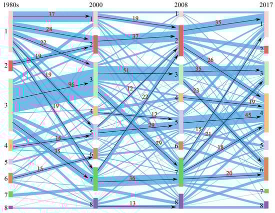 Adopting the trajectory-computing method, there are actually 260 types of trajectory in the households’ livelihood structure shift from the 1980s to 2017 (Figure 5). The results showed that only 7.98% of 451 households had no changes in livelihood structure, amongst which 21 households maintained the type of TF-income-dominated. Among the trajectory of changing livelihood structures, the largest category was track 3336 with 17 households. Both track 1224 and track 3373 have seven households, whereas track 1154, track 1554, track 3376, track 3776, and track 4554 all have six households. Figure 5 shows the Sankey diagram of the changes in the livelihood structure of 451 households and the top 10 tracks in each stage.