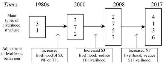 In the 1980s, the main types of livelihood structure were the TF income type and barren type (Table 2). From the 1980s to 2000, 44.79% of the households maintained their original livelihood structure, amongst which the majority of the households kept the TF income type or barren type. In addition, the majority of households increased the livelihood activities of SJ, NF, or TF, whilst the number of the barren type decreased significantly (Figure 6). The share of barren type decreased by 19.29%, and the joint income of TF and SJ increased by 13.3% in this stage. As a result, in 2000, the TF income type remained the largest type, followed by the joint income of TF and SJ.