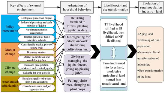 Since 1980, national and local govt. policies, climate change, market change, and regional urbanization are the key forces affecting household behaviors in traditional agricultural areas. Subsequently, household livelihoods and land use behaviors adapt to the changes actively or passively, such as returning farmland to forest, widely planting jujube, out-migrating for work, giving up jujube management, and, ultimately, leading to the transformation of households’ livelihoods–land use. Finally, the local livelihood showed a transition trajectory from the TF livelihood to SJ livelihood, and then to the NF livelihood; the local land use showed a transition trajectory from farmland to forestland, and from productive agricultural land to uncultivated land. The transformation of livelihoods–land use leads to the evolution of industry and population at the rural regional scale, which is mainly manifested as the weakening of the rural population, the non-agricultural transformation of industry, and eco-transformation of the land.