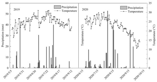 Precipitation and mean temperature during the 2019 and 2020 maize growing seasons.