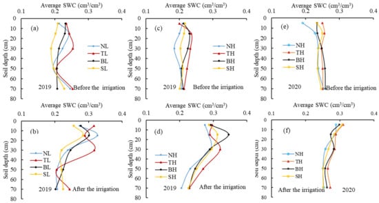 Average soil water content (SWC) during the 2019 and 2020 maize growing seasons. N, T, B, and S represent non-mulching, transparent plastic mulching, black plastic mulching, and straw mulching, respectively. H and L represent high irrigation and low irrigation during growing seasons. (a) SWC of NL, TL, BL, and SL treatment before the irrigation in 2019; (b) SWC of NL, TL, BL, and SL treatment after the irrigation in 2019; (c) SWC of NH, TH, BH, and SH treatment before the irrigation in 2019; (d) SWC of NH, TH, BH, and SH treatment after the irrigation in 2019; (e) SWC of NH, TH, BH, and SH treatment before the irrigation in 2020; (f) SWC of NH, TH, BH, and SH treatment after the irrigation in 2020.