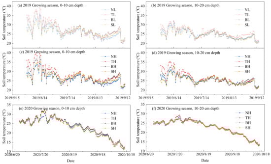 Dynamic change in daily soil temperatures at 10 and 20 cm depths among various treatments at the experimental site in north China. N, T, B, and S represent non-mulching, transparent plastic mulching, black plastic mulching, and straw mulching, respectively. H and L represent high irrigated and low irrigated during growing seasons, respectively. (a) Soil temperature of 0–10 cm soil depth under NL, TL, BL, and SL treatment during 2019 maize growing season; (b) soil temperature of 10–20 cm soil depth under NL, TL, BL, and SL treatment during 2019 maize growing season; (c) soil temperature of 0–10 cm soil depth under NH, TH, BH, and SH treatment during 2019 maize growing season; (d) soil temperature of 10–20 cm soil depth under NH, TH, BH, and SH treatment during 2019 maize growing season; (e) soil temperature of 0–10 cm soil depth under NH, TH, BH, and SH treatment during 2020 maize growing season; (f) soil temperature of 10–20 cm soil depth under NH, TH, BH, and SH treatment during 2020 maize growing season.