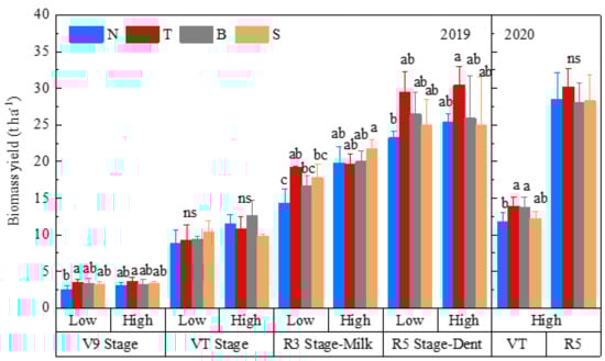 Biomass yield with different treatments during the maize growing season in 2019 and 2020. N, T, B, and S represent non-mulching, transparent plastic mulching, black plastic mulching, and straw mulching, respectively, H and L represent high irrigation amounts and low irrigation amounts during growing seasons, respectively. Means within the same growth stage followed by different letters are significantly different at p < 0.05, and ns denotes non-significance.