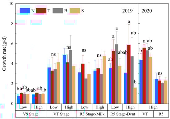 Growth rate with different treatments during the maize growing season in 2019 and 2020. N, T, B, and S represent non-mulching, transparent plastic mulching, black plastic mulching, and straw mulching, respectively, High and Low represent high irrigation amounts and low irrigation amounts during growing seasons, respectively. Means within the same growth stage followed by different letters are significantly different at p < 0.05, and ns denotes non-significance.