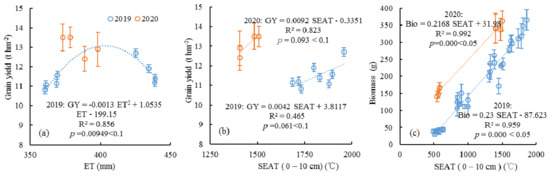 Relationship of ET and grain yield, SEAT of a 0–10 cm soil depth and grain yield, and SEAT of a 0–10 cm soil depth and biomass in 2019 and 2020: (a) relationship between ET and GY; (b) relationship between SEAT of 0–10 cm and GY; (c) relationship between SEAT of 0–10 cm and biomass.