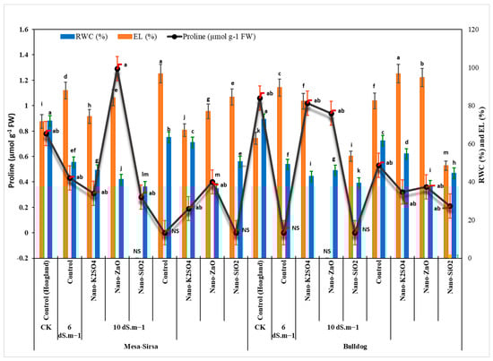 Effect of different nano-fertilizers (K2SO4, ZnO, and SiO2) on Relative Water Content (RWC), Electrolyte Leakage (EL), and Proline content to Alfalfa genotypes grown under three salt levels (control “Hoagland”, 6 and 10 dSm−1).