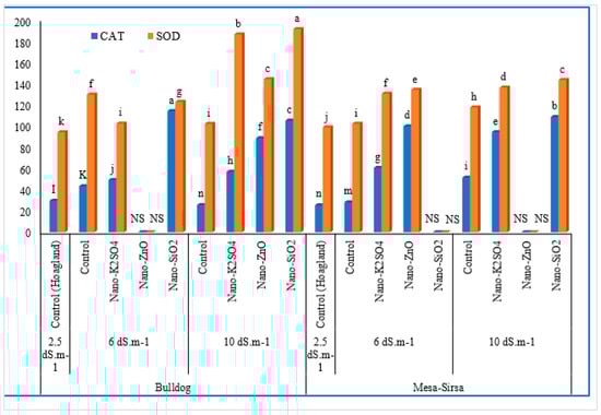 Catalase activity in alfalfa leaves increased with increased salt concentration by 16.8% and 31.6% and 33.3% and 50.2% at 6 and 10 dS m−1 with Bulldog 505 and Mesa-Sirsa genotypes, respectively. These results agree with those from the authors of [79] who clarify the activity of catalase, which increased in leaf tissues of soybean under salinity stress. Application of nano-fertilizer treatments had significant effects (p < 0.01) on catalase (CAT) and sodium oxide dismutase (SOD) contents in both alfalfa genotypes under different salt levels (Table 3 or Figure 2). As a result, the motivation of the active antioxidant enzymes considers an acclimation strategy that plants use to vanquish oxidative stress [80]. The response of alfalfa plants for CAT and SOD activity was assimilated with the application of nano-SiO2 with both genotypes (Table 3 or Figure 2). These results agreed with those in [26,61,81]. Nano-SiO2 has been shown to increase the activity of antioxidant enzymes, which has improved the plant’s tolerance to salinity stress. [26,82]. Regarding zinc, when wheat plants were treated with 500 ppm non-ZnO, a marked increase in POD activity and root cell lignification was observed [83]. Similarly, an increase in activities of SOD and POD activities using non-ZnO (25–200 mg L−1) in cotton plants was reported in comparison to control plants [84]. The improvement of salt tolerance resulting from the nano-SiO2 treatment was accompanied by the improvement of membrane stability, sugar accumulation, and chloroplast formation. It was concluded that silicon Nano treatments can reduce the harmful effects of salinity on V. faba plants by enhancing the activity of antioxidant enzymes [85].