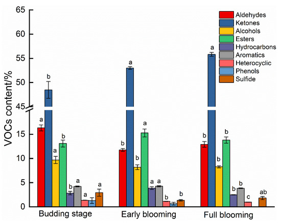 As shown in Figure 1, alfalfa VOCs were mainly composed of aldehydes, ketones, alcohols and esters, which accounted for 87.41%, 88.57% and 90.85% of the total VOCs at budding stage, early blooming and full blooming respectively, the content of other types of VOCs was low. With the extension of the harvest period, the alfalfa aldehydes and alcohols content showed decreased, and at the early blooming and full blooming content was significantly lower than at the budding stage (p < 0.05). The content of ketones showed a gradual increase, and their content at early blooming and full blooming was significantly higher than that at the budding stage (p < 0.05). Esters showed a trend of first increasing then decreasing, and the content at early blooming was significantly higher than at both budding stage and full blooming (p < 0.05).