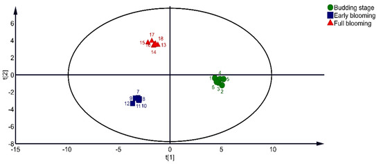 OPLS−DA 2D scores of alfalfa at different harvest periods.