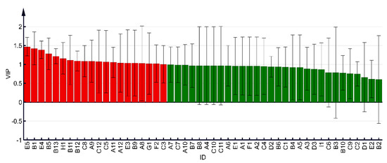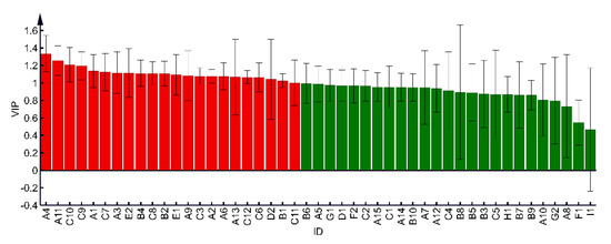 Using the OPLS-DA model for discriminant analysis of alfalfa, the model quality parameters were R2X = 0.768, R2Y = 0.993, Q2 = 0.972, both greater than 0.7, indicating that the model had a good fitting ability, and predictive ability [17,18]. As shown in Figure 2, according to VOCs, different harvesting periods of alfalfa can be clearly distinguished. The budding stages are shown in quadrant IV, early blooming in quadrant III, and full blooming in quadrant II. This shows that the harvest period significantly affects alfalfa VOCs (p < 0.05). As shown in Figure 3, the OPLS-DA model screened a total of 20 compounds with variable importance in projection (VIP) > 1. The 20 VOCs included 4 aldehydes (2,5-dimethylbenzaldehyde, 3-cyclohexadiene-1-carboxaldehyde,2,6,6-trimethyl-1, 2,6,6-trimethyl-1-cyclohexene-1-carboxaldehyde, benzeneacetaldehyde,a-ethylidene-), 6 ketones (6-methyl-5-hepten-2-one, 2-cyclopenten-1-one,3,4,3-trimethyl-, 6-methl-3-(1-methlethyl)-2-(2-oxopropyl)-cyclohexanone, geranylacetone, 4-(2,6,6-trimethyl-1-cyclohexenyl)-3-buten-2-one, 2-pentadecanone,6,10,14-trimethyl-), 4 alcohols(linalool, 2,6-dimethylcyclohexanol, phenethyl alcohol, 2-[(9Z)-9-octadecenyloxy]-ethanol), 3 hydrocarbons (dodecane,5,8-diethyl-, 9-hexylheptadecane, 2,6,10-trimethyl-tetradecane), 1 phenol (5-allylguaiacol), 1 sulfide (dimethyl sulfide), and 1 heterocyclic(2-pentylfuran). These 20 VOCs are the differential VOCs for the different harvest periods of alfalfa.
