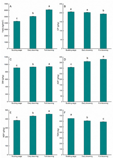The effects of harvest period on nutritional quality of alfalfa (A–F). (A) yield, (B) crude protein (CP), (C) dry matter (DM), (D) acid detergent fiber (ADF), (E) neutral detergent fiber (NDF), (F) total digestible nutrients (TDN). Bars indicate standard error of the means. Different lowercase letters indicate significant difference at p < 0.05.