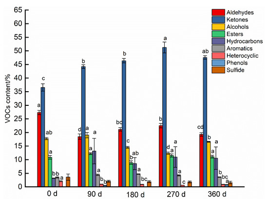 As shown in Figure 5, aldehydes, alcohols and esters were the highest, while ketones were the lowest after 0 days of storage (p < 0.05); ketones increased significantly and aldehydes decreased significantly after 360 days of storage (p < 0.05).