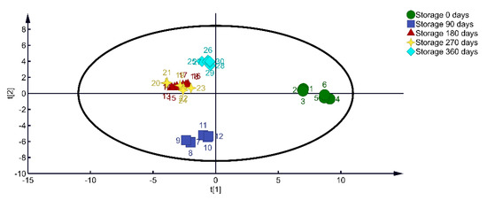 OPLS−DA 2D scores of alfalfa at different storage durations.