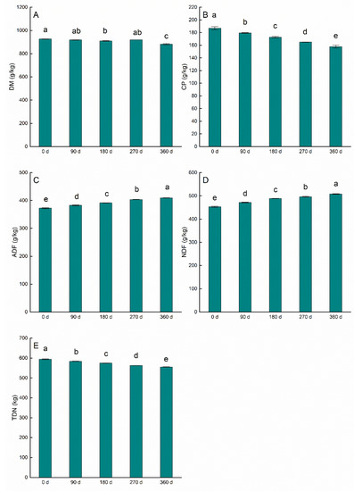 The effects of storage durations on nutritional quality of alfalfa (A–E). (A) dry matter (DM), (B) crude protein (CP), (C) acid detergent fiber (ADF), (D) neutral detergent fiber (NDF), (E) total digestible nutrients (TDN). Bars indicate standard error of the means. Different lowercase letters indicate significant difference at p < 0.05.