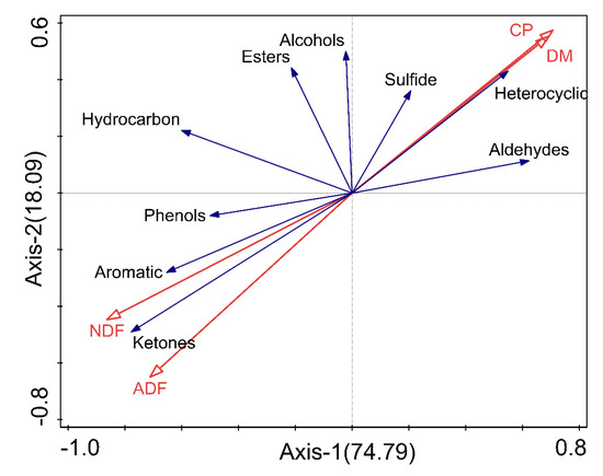 There is an inextricable link between nutrients and volatile organic compounds, as evidenced by many agricultural products such as apples and papayas [19,20,21]. As shown in Figure 9, the RDA results for Axis1 and Axis2 explained a total of 92.88% of the variation. The correlations between nutrients and VOCs are indicated by the angles of the red and blue arrows, arrows pointing in almost the same direction indicate a highly positive correlations, while arrows oriented at right angles indicate nearly zero correlation, and arrows pointing in opposite directions indicate a highly negative correlations [22]. There was a positive correlation between ADF and NDF and ketones, aromatic, hydrocarbon, and phenolic compounds. NDF had a significant effect on the formation of ketones, aromatics, hydrocarbon, and phenolics, especially for ketones (NDF F = 5.5, p = 0.024). There was a positive correlation between CP, DM and heterocycles, aldehydes, sulfides, and alcohols (p > 0.05).