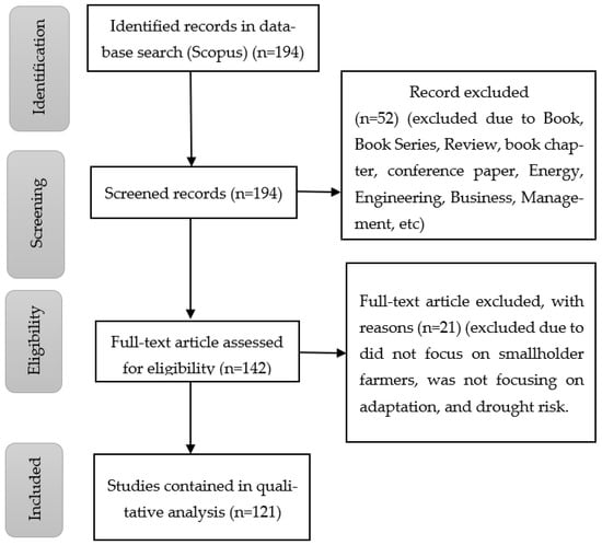 To explore the current literature on smallholder farmers’ perception and adaptation to drought vulnerability, we conducted a systematic literature review based on the rules suggested by []. For this study, there were four stages to the systematic review method. In March 2021, the review was completed. The first phase defined the terms that will be utilized in the search. Keywords relating to smallholder farmers’ perceptions and adaptations to drought vulnerability were utilized, with a total of 194 published records retrieved, based on prior studies (Table 2). The screening stage came next. A total of 52 articles were deleted from the (n = 194) that were not eligible to be reviewed at this stage. The reason for removing these articles was due to the fact that most of them were not truly focusing on (PASSFDR). At the eligibility stage, a total of (n = 21) papers were removed after a thorough review since some did not focus on smallholder farmers, perception, adaptation, drought, or vulnerability. A total of (n = 121) papers were chosen for qualitative analysis (Figure 1).