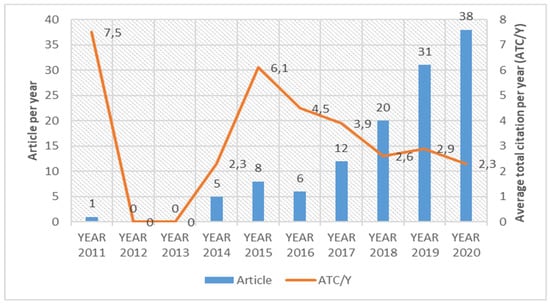 From 2011 through 2020, annual scientific productivity for PASSFDR publications indexed in Scopus. ATC/Y stands for average total citations of published papers per year. NB The annual percentage rate of increase is 68.14.