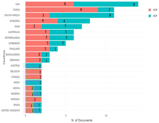 Top 20 most productive nations in PASSFDR documents indexed in Scopus (2011–2020). MCP: Multiple country production, SCP: Single country production.