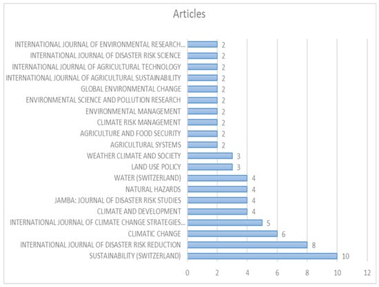 Figure 4 and Table 5 show the top journals with the most PASSFDR articles published. Several institutions urge their scholars to publish their findings in high-impact journals with a large number of citations and a wide readership [,]. These relevant sources encompass a wide range of topics in their respective articles. Climate change, disaster risk, management, agriculture, and the environment were all prominent themes in most of the journals, the Journal of Sustainability (Basel, Switzerland) came out on top. With (n = 8, 6.6 percent), the International Journal of Disaster Risk Reduction came in second. Journal of Climatic Change was ranked third with (n = 6, 5.0%), followed by the International Journal of Climate Change Strategies and Management (n = 5, 4.1%). Climate and Development, Jamba: Journal of Disaster Risk Studies, Natural Hazards, and Water (Basel, Switzerland) were ranked fourth with the same number of published articles (n = 4, 3.3%). Fifth in rank were Land Use Policy and Weather Climate and Society with (n = 3, 2.5%) published articles. Agricultural Systems, Agriculture and Food Security, Climate Risk Management, Environmental Management, Environmental Science and Pollution Research, Global Environmental Change, International Journal of Agricultural Sustainability, International Journal of Agricultural Technology, International Journal of Disaster Risk Science, International Journal of Environmental Research and Public Health were ranked seventh with (n = 2, 1.7%) each in the number of published articles on PASSFDR.
