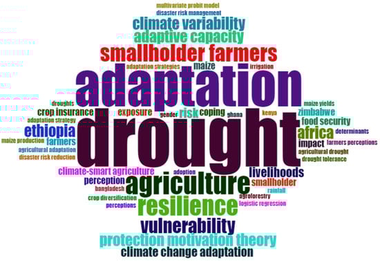 Figure 5 shows the results of a word cloud of the 50 most commonly occurring author’s keywords in PASSFDR investigations. During the analytic period, a word cloud summarized the most common important phrases used by writers on PASSFDR research. The magnitude of each keyword in the word cloud network indicates its importance and frequency in the PASSFDR literature. It could be deduced that the nearer the keywords are to one another, the more possible their interaction in the literature throughout the study period []. The word cloud depicts the most often used words in PASSFDR research, making it simple to spot key areas of interest in this specialty. Drought, adaptation, smallholder farmers, agriculture, climatic variability, resilience, vulnerability, and adaptive capacity, for example, were found to be some of the most common terms in PASSFDR. Other predominant keywords are protection motivation theory, climate adaptation, risk, Africa, Ethiopia, livelihood, coping, perception, etc. This further confirms the important areas that researchers are focusing on in drought-related research. It, therefore, means that the agricultural sector which is the main source of livelihood for farmers needs to have proper adaptation strategies in place to mitigate the effect of drought.