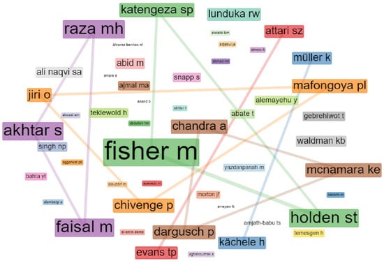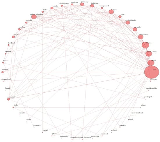 The information in Figure 6, Figure 7 and Figure 8 presents the collaboration network analyses of authors’, institutions, and countries respectively in PASSFDR research during the period of investigation (2011 to 2020). This network analysis shows the robustness and occurrence of 50 authors, organizations, and nations. In the diagrams, each colored node signifies an author, an organization, and a nation meanwhile the connecting lines illustrate the frequency of cooperation and the node diameter denotes the strength of the partnership. In the collaboration network, the thicker the line connecting them, the stronger the association between them and vice versa []. The outcome in Figure 6 showed that authors like Fisher [,], have the strongest collaboration. [] happens to be the author with the greatest number of published papers (five) within the period under review. The second stronger collaboration network is the association among Akhtar, Faisal, and Raza. The results of the collaboration network analysis for institutions (Figure 7) revealed that Nanjing Agricultural University has the largest node, indicating that it has the highest frequency and strength of collaboration. The Nanjing Agricultural University has the strongest links with Dilla University in Ethiopia and the National and Local Joint Engineering Research Center for Rural Land Resources Use and Consolidation in China. Along with the Nanjing Agricultural University, other institutions such as the University of Kwazulu-Natal, the University of Zimbabwe, the International Crop Research Institute for the Semi-Arid Tropics, Michigan State University in the United States, and Cornell University in the United States were also ranked among the top six with strong collaborative strength. In Figure 8, the United State of America and China is ranked first and second respectively with the strongest collaborative strength. While South Africa, Ethiopia, and Zimbabwe were ranked third, fourth and fifth respectively. There is a strong collaboration network between South Africa and Zimbabwe. [], citing the works of [,,], noted that there are several adaptation/coping mechanisms to drought disaster, which include crops or livestock diversification, improving irrigation, and growing shade-giving plants for agriculture, among others. Table 7 presents a list of some of the adaptation/coping strategies employed by the farmer to mitigate the adverse effect of drought in their various locations.