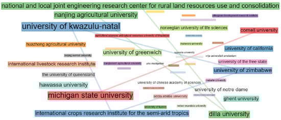 The word cloud which depicts the most often used words in PASSFDR research has shown the extent of each keyword. It is feasible to deduce that the closer the keywords are to one another, the more conceivable their interaction in the literature throughout the research period. The network collaboration of authors has revealed the strongest collaboration among Fisher, Holden, and Katengeza possibly because they have the highest number of published articles within the period of review. According to the collaboration network analysis for institutions in Figure 7, Nanjing Agricultural University (NAU) has the highest strength and frequency of association. NAU is one of China’s oldest and most famous agricultural universities, administered by the Ministry of education. The list of adaptation and coping strategies provided serves as a guide for farmers to mitigate drought risk, while that of drought indices serves as a guide for researchers to know the appropriate drought indices to apply for any given task relating to drought.