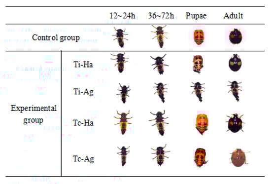 As the ladybirds and pea aphids were treated with different kinds of pesticides and fed with different methods, the development and phenotypic changes of ladybirds were observed. Figure 1 shows the Tc-Ha and Tc-Ag groups for ladybirds fed on the aphid treated with chlorpyrifos, which developed from the 4th instar larvae to the adult stage. The group that was exposed to the insecticide indirectly by feeding on aphids sprayed with imidacloprid in this experiment failed to pupate.