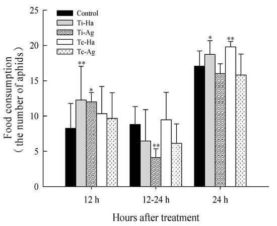 The food consumption rates of ladybirds in four treatments and control. * and ** in the column respectively represent significant and extremely significant differences from the control group at 0.05 and 0.01 (one-way ANOVA), respectively.