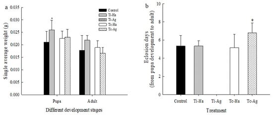 (a) The average single weight changes of ladybirds in treated and control pupae and adults. (b). The developmental duration (from pupa to adult) changes of ladybirds between treatments and control. * on the column respectively represent significant differences from the control group at 0.05 (one-way ANOVA), respectively.