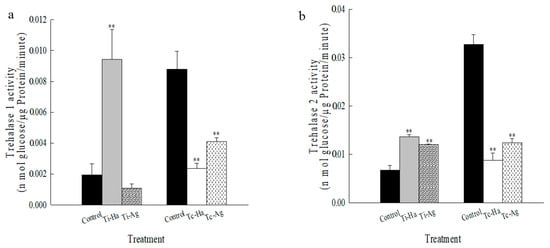 When treated with different pesticides, the changes in TRE1 and TRE2 in ladybirds were different. The activity levels of TRE1 and TRE2 with Tc-Ha and Tc-Ag in ladybirds were 0.002356, 0.001095, and 0.008752, 0.0124, respectively, meaning they were significantly decreased compared to the control (0.089729, 0.0328) (p < 0.01) under chlorpyrifos stresses. These differences demonstrated that the ladybirds have obvious physiological responses to pesticide stress (Figure 4a,b). The activity levels of TRE1 and TRE2 in all groups of ladybirds treated with imidacloprid showed increased enzyme activities. Compared to the chlorpyrifos treatment, the activity changes in TRE1 and TRE2 were totally different under the imidacloprid stress. The activity level of TRE1 in Ti-Ag was 0.00107 under imidacloprid stress, which was significantly lower than in Ti-Ha. However, the activity changes in TRE2 were significantly increased both in Tc-Ha and Tc-Ag (0.0136, 0.012) compared to the control (0.00676) (p < 0.01) (Figure 4b).