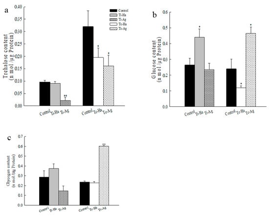 When treated with the two pesticides, the trehalose content in ladybirds was 0.0219, and it was significantly decreased in Ti-Ag (p < 0.01) (Figure 5a), while the trehalose contents in Tc-Ha and Tc-Ag were 0.195 and 0.1615, respectively, being significantly decreased compared to the control (p < 0.05) (Figure 5a). According to the direct (Tc-Ha) or indirect (Tc-Ag) exposure to pesticides, the glucose levels in ladybirds treated with chlorpyrifos showed a significant increase or decrease (p < 0.05) (Figure 5b), and the glycogen content in Tc-Ag was significantly increased, while the rest showed no significant change (p < 0.01) (Figure 5c). The glucose content in Ti-Ha showed a significant increase (p < 0.05) (Figure 5c), while the glycogen content showed a decreasing trend but was not obvious in the Ti-Ag (Figure 5c).